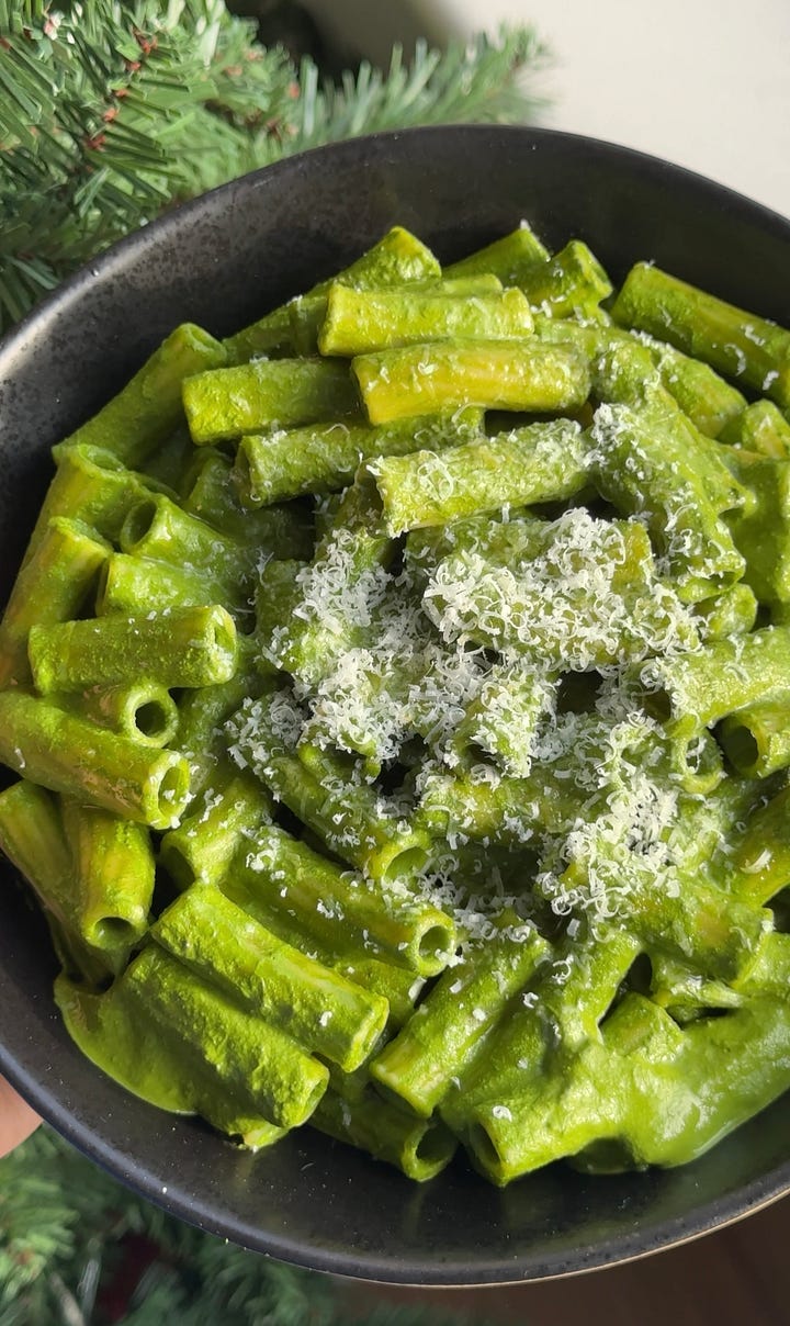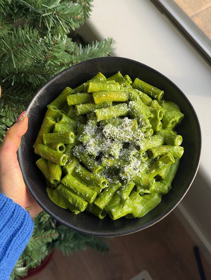 Hi cuties!! I am SO excited for today’s date. If I am being so honest, I genuinely cannot remember the last time I consumed a vegetable… specifically a green vegetable. There’s just something about the holiday season, the sun going down at 4pm, and the absolutely frigid temperatures outside that makes eating GREEN vegetables…. extremely hard to do lmao. I have consumed my body weight in comfort foods for about a month straight and so we have finally reached the point where my body is literally screaming for something of nutritional value. So I present to you… GRINCH PASTA !