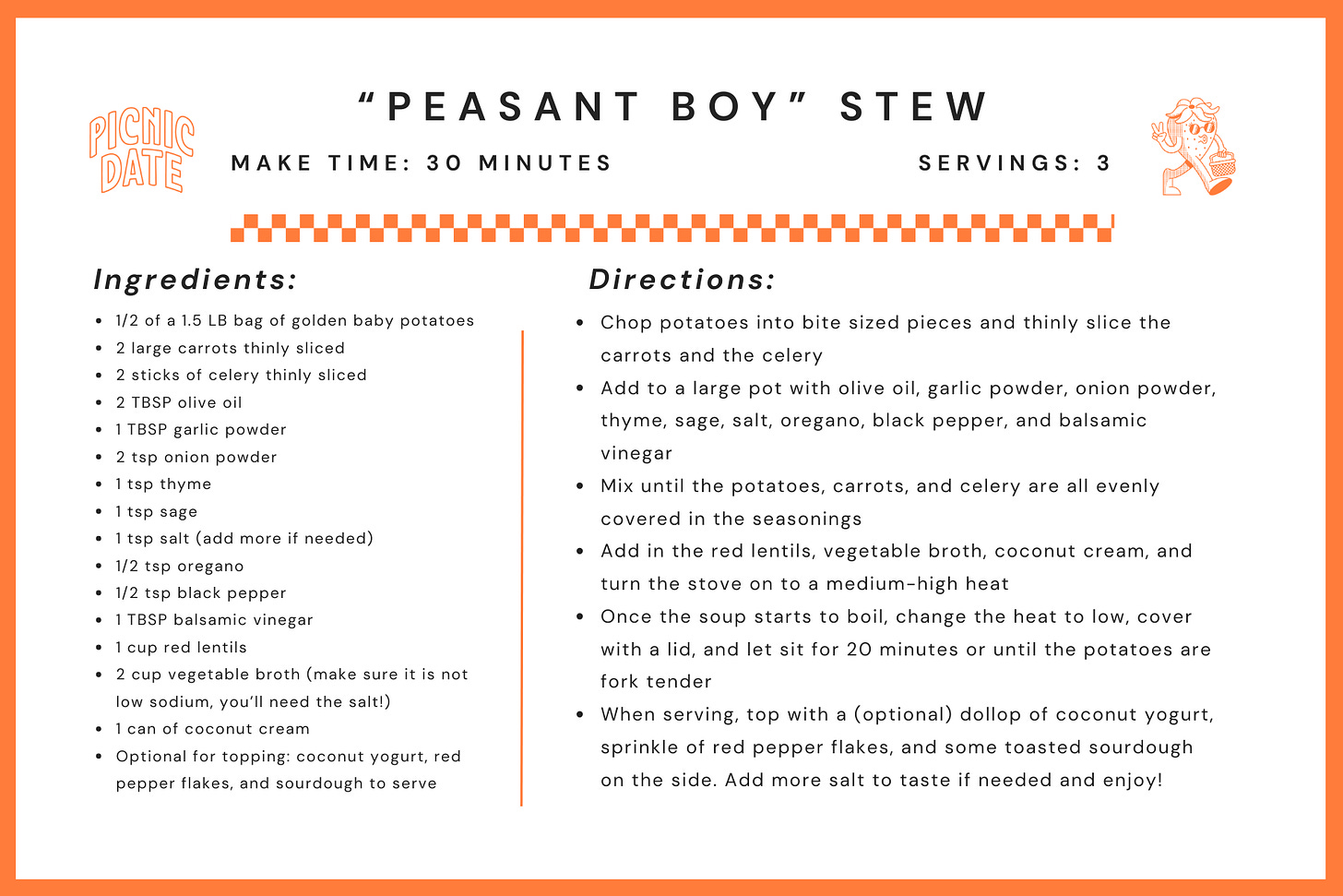 Including a full grocery list and the recipes for Veggie Lasagna Soup, Peasant Boy Stew, and the Greenest Soup you'll ever eat <3
